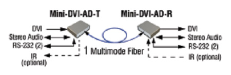 通过1根多模光纤可以传输1路单向DVI视频,1路双向立体声音频和2路双向RS-232数据。 |